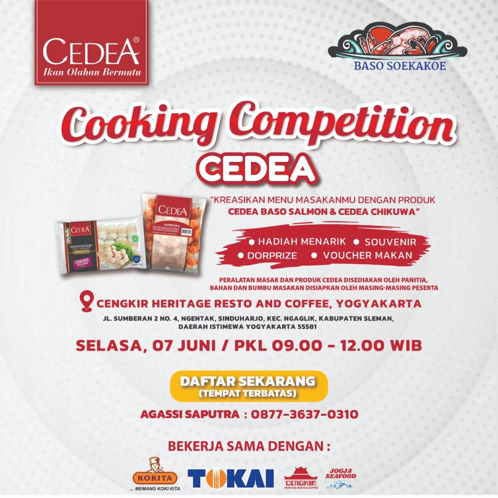 CEDEA hadir membawa keseruan memasak didalam acara CEDEA COOKING COMPETITION 2022, yang berlangsung di Cengkir Heritage Resto And Coffee, Yogyakarta. Di acara ini peserta akan berkompetisi untuk menyajikan menu terbaik menggunakan produk CEDEA, acara yang berlangsung pada Selasa 7 Juni 2022 ini berlangsung berkat kerja sama Distributor Cedea Jawa Tengah : CV Bakso Soekakoe dan juga Brand : Kokita, Tokai, Cengkir Heritage, dan Jogja Seafood.